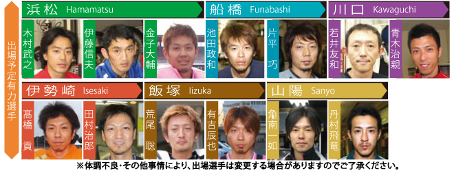 主な出場予定選手は絶対王者・高橋貢やSG全日本選抜を制した有吉辰也が登場!他にも伊藤信夫、金子大輔、池田政和、荒尾聡とスピード自慢が勢ぞろい!