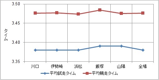 | 開催場 | レース数 | 平均試走T | 平均競走T |