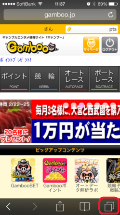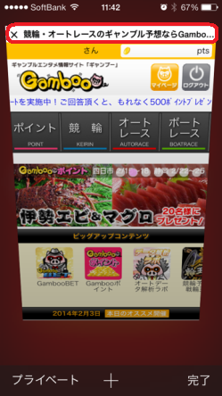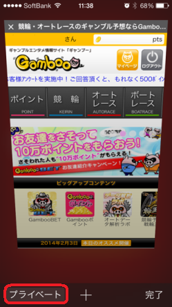 | (4) 画面上部のグレーの帯が白く変わります これで「プライベートブラウズ」を「オフ」にできました。この状態にて、GambooBETオートレースをお楽しみください |