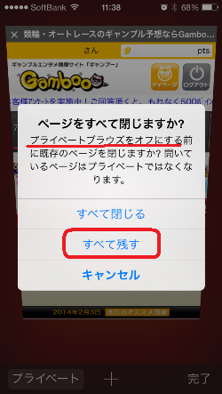 | (3) これで「プライベートブラウズ」を「オフ」にできますが、既存の開いているページをどうするか聞いてきます ※このまま続けるなら「すべて残す」をタッチしてください |