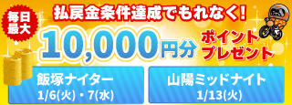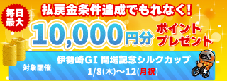 伊勢崎GIは払戻金条件達成で毎日最大10,000円分のポイントプレゼント(1/8~12)