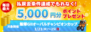 飯塚GII払戻金条件達成で毎日最大5,000円分のポイントプレゼント(1/21~25)
