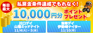 払戻金条件達成で毎日最大10,000円分のポイントプレゼント(11/4~5・11/10)