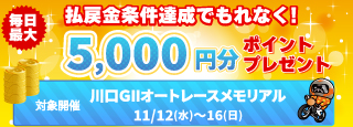 川口GII払戻金条件達成で毎日最大5,000円分のポイントプレゼント(11/12~16)