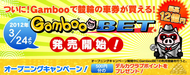 2012年3月24日より、発売開始予定のGambooBETの 事前利用登録受付を開始しました! お得なオープニングキャンペーンを実施中! お早めの事前利用登録が断然お得です! Gambooで予想情報をGETしたら、GambooBET利用登録者の方はそのまま車券購入! もちろんパソコン・ケータイ・スマートフォンに完全対応!いつでもどこでも車券購入することが可能です。 詳しくはコチラ