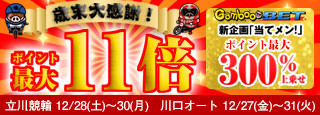 いよいよ、競輪・オートレース年末2大開催が開幕します!! 今年最後の大勝負!ぜひGambooBETでお得にお楽しみください!!! 【対象開催】 12/28(土)~12/30(月)「KEIRINグランプリ2013シリーズ(立川)」(競輪) 12/27(金)~12/31(火)「スーパースターフェスタ2013(川口)」(オートレース) 詳しくはこちら
