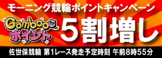 佐世保競輪では、第1レースが午前8時55分発走予定のモーニング競輪を開催します。 Gambooでは、この2開催を対象にポイントを5割増し! さらに、GambooBET限定で、第1レース~第3レースではプラス5割増し! さらにさらに、佐世保競輪オリジナルクオカードを20名様にプレゼント! ぜひ、いますぐ、エントリー!!! [対象期間] 2月28日(金)~3月2日(日) 3月28日(金)~30日(日)