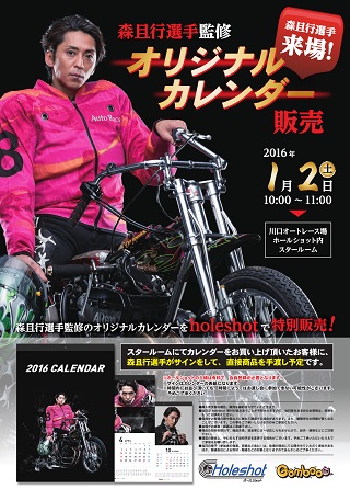 2016年1月2日(土)に森選手が川口オートレース場「ホールショット」に来場し、 カレンダー特別販売会を実施します! ホールショット内スタールームにてカレンダーをお買い上げ頂いたお客様に、 森且行選手がサインをして、直接商品をお渡しする予定です。 【日時】 2016年1月2日(土)10:00~11:00 【場所】 ホールショット内スタールーム 詳しくはこちらをご覧ください!