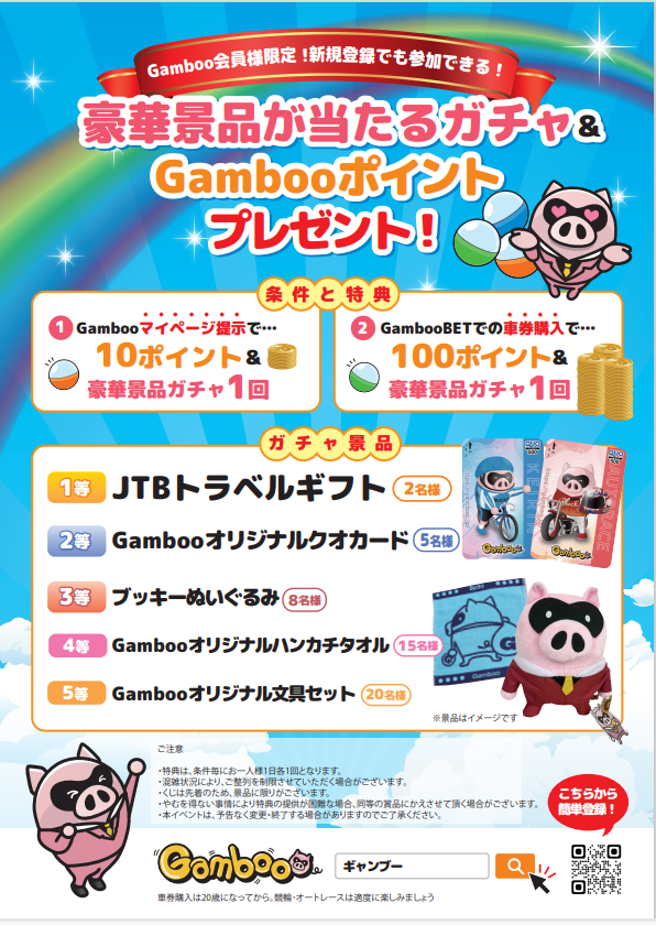 下記の日程でGambooブースを出展致します! Gamboo会員様は、ポイントGET&豪華景品が当たるチャンス!! ※条件毎にお一人様1日1回ずつ ※景品がなくなり次第終了 【日程】 2025/6/21(土)~22(日) 岸和田競輪場内特設ブース ぜひお越しください! 高松宮記念杯競輪を現地で楽しみましょう!!