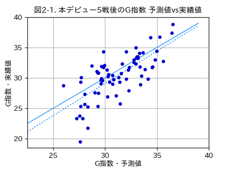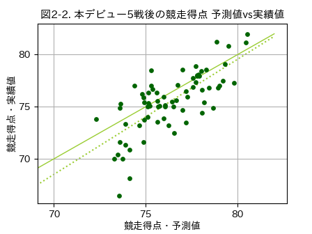ちなみに予測値と実績値の回帰直線は図中の破線となり、実線より若干ずれた位置となったぞ。この結果は今年新人(127期)の初期成績予測にフィードバックじゃ。