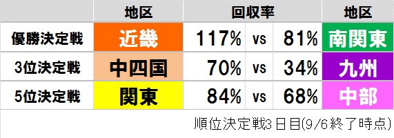 3位決定戦では、依然として中四国地区が九州地区の約2倍の回収率と、大きくリードを続けています。
