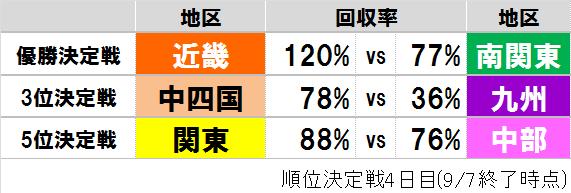Gamboo甲子園団体戦の順位決定戦4日目(9/7)を終了した時点での各対戦の回収率は以下の通りです。