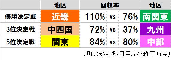 Gamboo甲子園団体戦の順位決定戦5日目(9/8)を終了した時点での各対戦の回収率は以下の通りです。