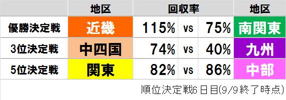 Gamboo甲子園団体戦の順位決定戦6日目(9/9)を終了した時点での各対戦の回収率は以下の通りです。