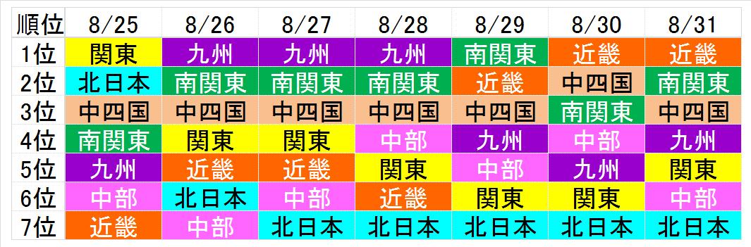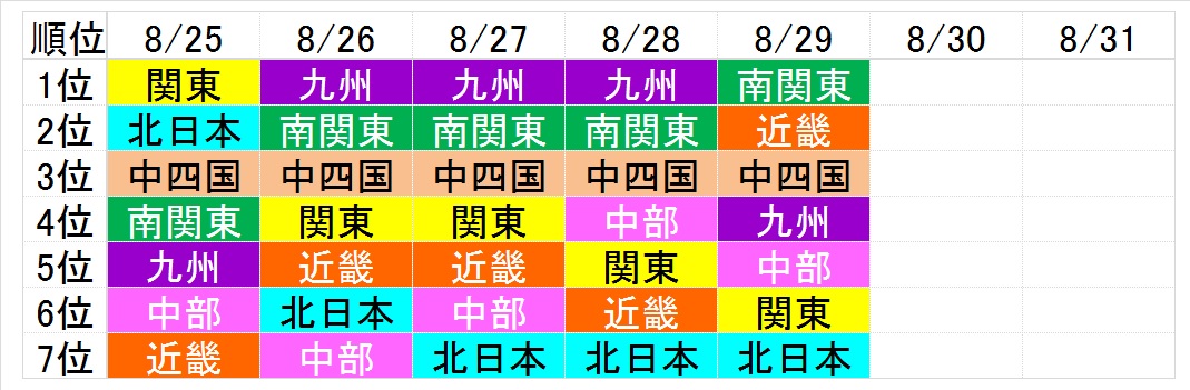 ここにきて、近畿が奪首。中四国も2位に上昇。
