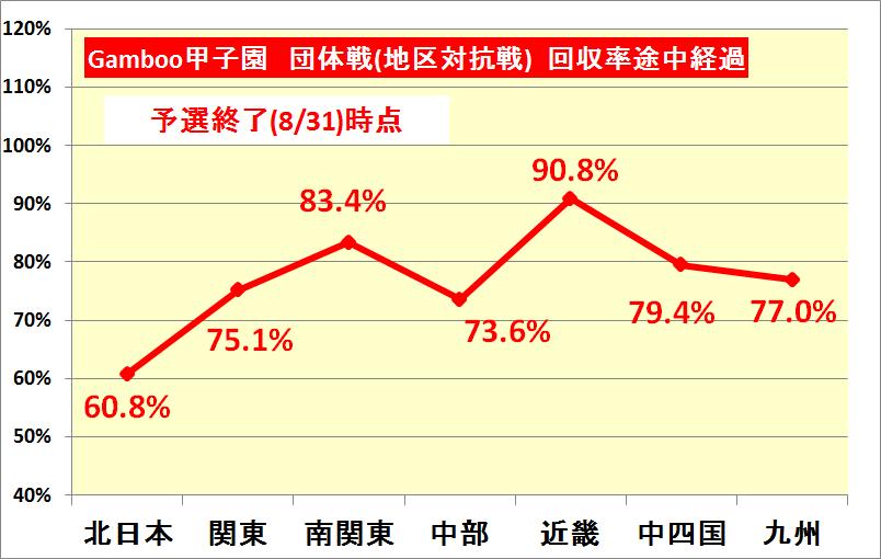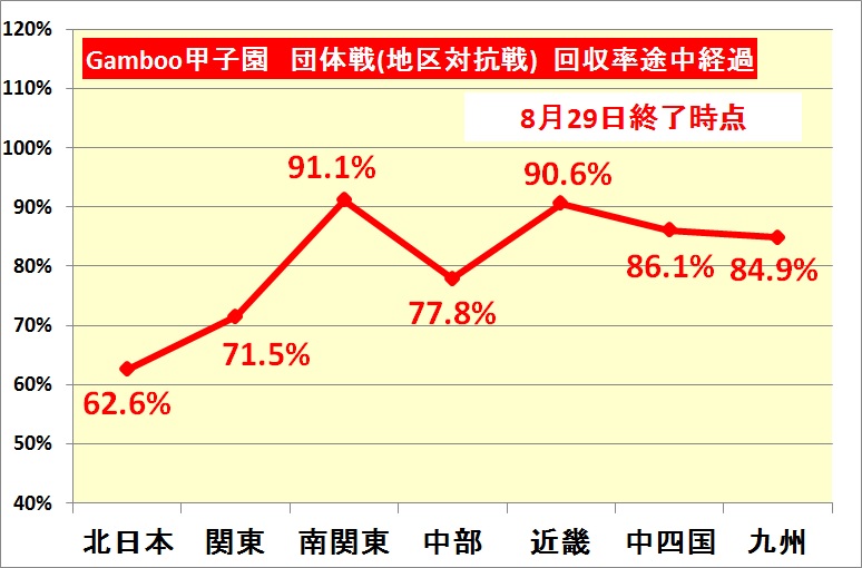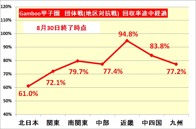 Gamboo甲子園の五日目(8月29日)を終わった時点での団体戦(地区対抗戦)の回収率は以下の通りです。