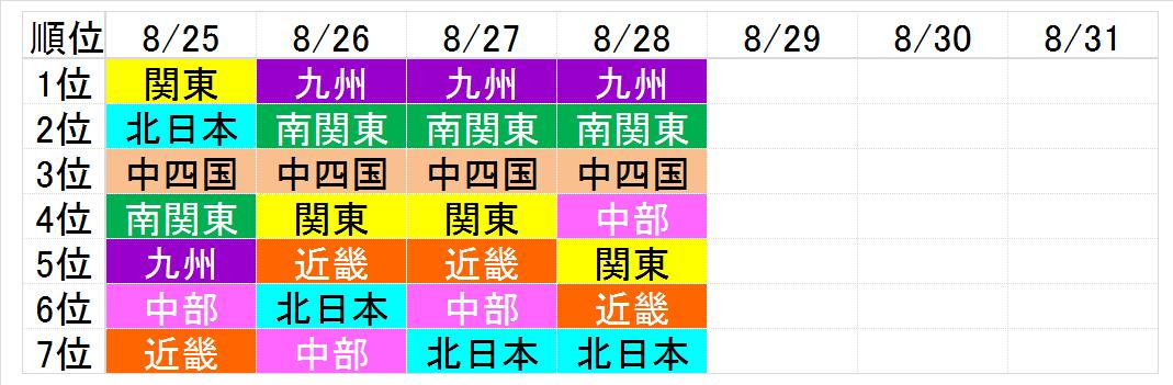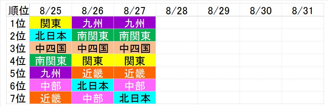 1位九州・2位南関東・3位中四国の順位は変わらず。
