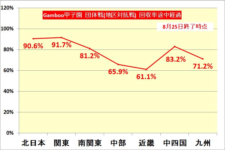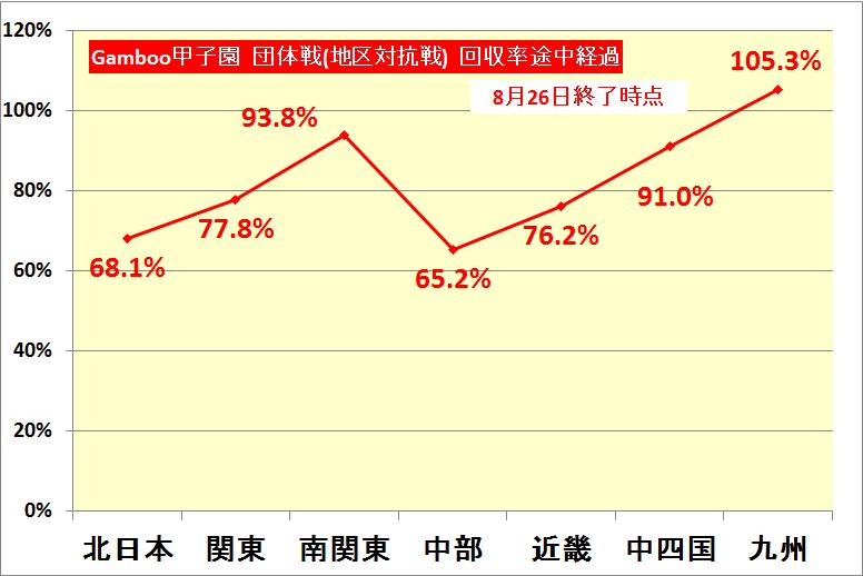 Gamboo甲子園の二日目(8月26日)を終わった時点での団体戦(地区対抗戦)の回収率は以下の通りです。
