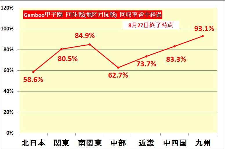 Gamboo甲子園の三日目(8月27日)を終わった時点での団体戦(地区対抗戦)の回収率は以下の通りです。
